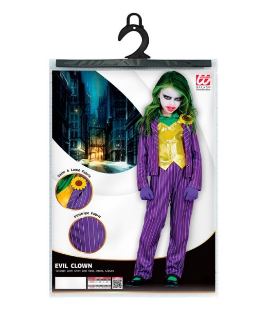 Ond Joker kostume i farverigt design med jakke, fastsiddende skjorte og vest, matchende bukser og handsker. Jakken og bukserne har stribet mønster, mens vesten skaber et markant kontrastlook. Velegnet til temafester, karneval og halloween.