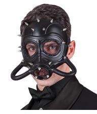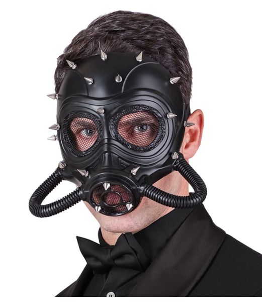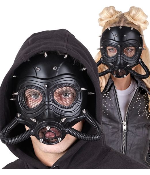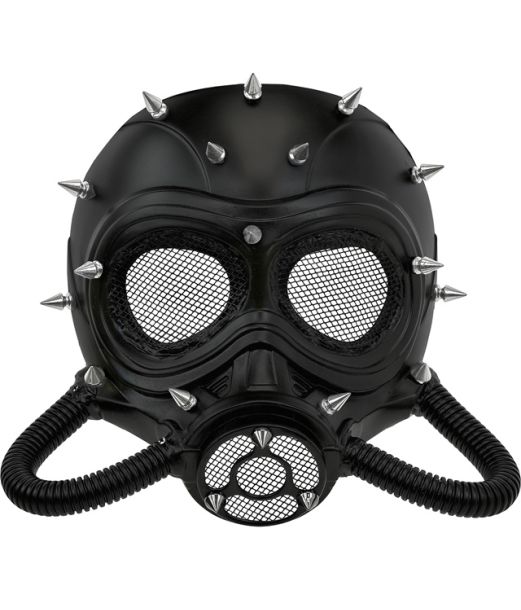 Denne sorte gasmaske er designet i et råt, industrielt look og prydet med sølvfarvede nitter, der giver et dystert og kantet udtryk. Masken er lavet i hård plastik og har mesh over øjnene samt fleksible slanger for et ekstra dramatisk udseende.